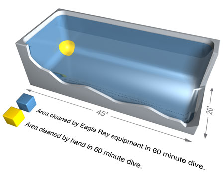 The design of our scrub head is inherently safe, and ergonomic function has been added for diver comfort. Our engineering department has incorporated a “dead man” on/off switch into our submersible scrub head. When a diver lets go of the trigger, the motor stops spinning. The counter rotating brushes are extremely stable and eliminate torque steer. The angled handles, combined with the counter rotating brushes, eliminate diver fatigue.